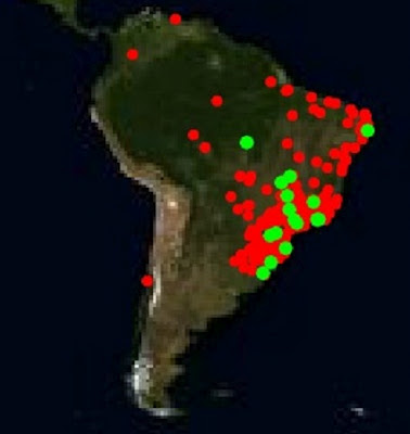 Pontos vermelhos - cidades que registraram acesso ao MM com suas Sementes.